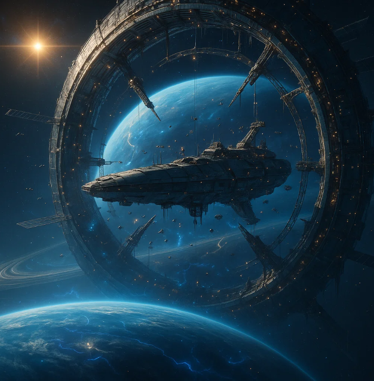 Огромная орбитальная станция строит звёздный крейсер вокруг планеты-гиганта цвета сапфира. Сотни роботов и дронов плавают в невесомости, панели солнечных батарей отражают свет. На фоне — сияние атмосферных бурь и кольца, охватывающие планету.