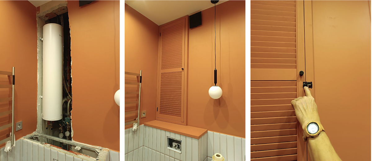 Комплектация квартиры - это не только закупка и расстановка мебели. Часто приходится попутно решать разные технические задачи. Например, как в этом случае: клиентка попросила придумать простое и относительно недорогое решение, как закрыть техническую нишу с бойлером и счетчиками в ванной. А заодно и инсталляцию. При этом и к нише, и к инсталляции нужно было сохранить доступ. Да, и если мы еще не знакомы: меня зовут Лена Володина, я профессионально занимаюсь инвест-ремонтами и комплектацией квартир под сдачу, а потом зачастую помогаю клиентам их выгодно сдать. Более оперативно о своих объектах рассказываю в своем телеграм-канале "Пока меня не было" Я сразу же написала Денису - он делает реечные экраны под ванную и шкафы с реечными дверками. Но Денис, как назло, оказался в отпуске. Пришлось создавать задачу на Юду. Мастер приехал на замер, предложил конструкцию и уехал в Лемана про - покупать дверцу и краску по дереву, чтобы заколеровать ее в цвет стен. И несколько дней спустя смонтирова