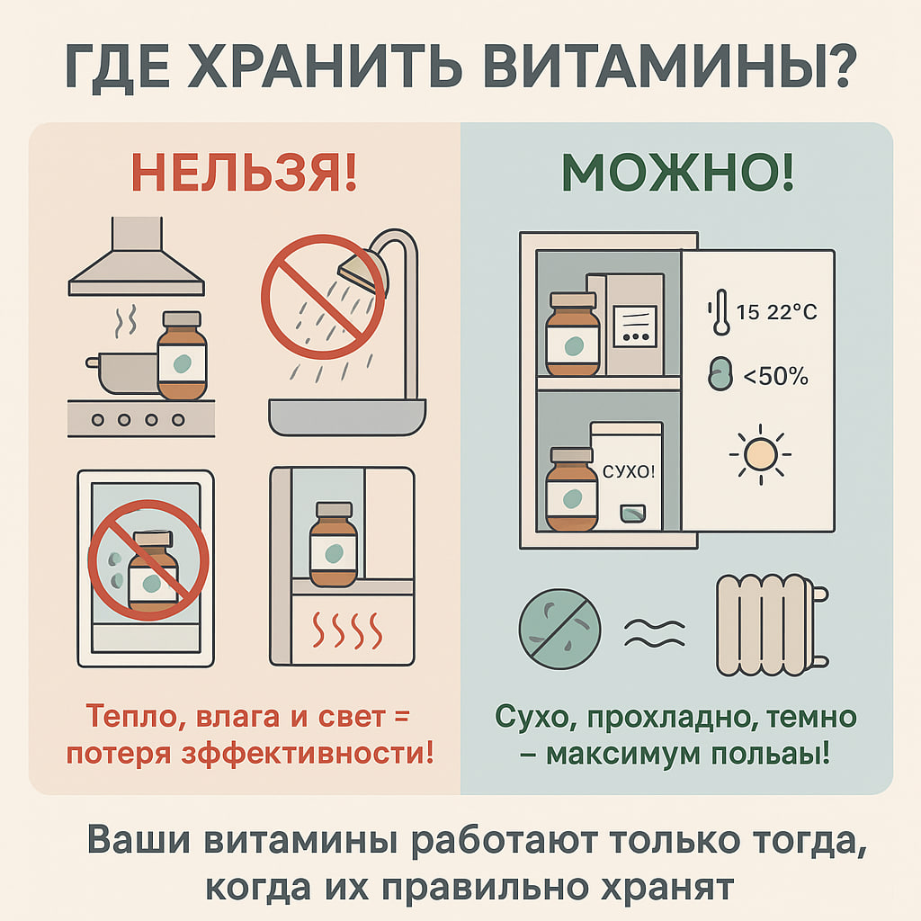 Давайте я отгадаю, вы наверняка держите их на кухне — на полке рядом с вытяжкой, над плитой или в шкафчике, под которым у вас чайник стоит. Или, может, в ванной — ведь там всё под рукой? ❌ Ошибка! К сожалению, это самые худшие места для хранения добавок. Температура, влажность и солнечный свет — главные враги витаминов и БАДов. Под их воздействием активные вещества разрушаются, и вы просто не получаете того, за что заплатили. Что особенно чувствительно? Водорастворимые витамины (C, B1, B6, B12, фолиевая кислота) — быстро теряют активность во влажной среде. Жирорастворимые витамины (A, D, E, K) — чувствительны к свету и теплу. Омега-3 и рыбий жир — окисляются при контакте с воздухом и теплом, могут прогоркнуть. Пробиотики — требуют особых условий: часто их действительно нужно хранить в холодильнике, но только если это указано на упаковке. Аминокислоты и белковые порошки — гигроскопичны: впитывают влагу и могут слёживаться или терять эффективность. ❄️ Вы скажите: Холодильник! ❌ Фатальная