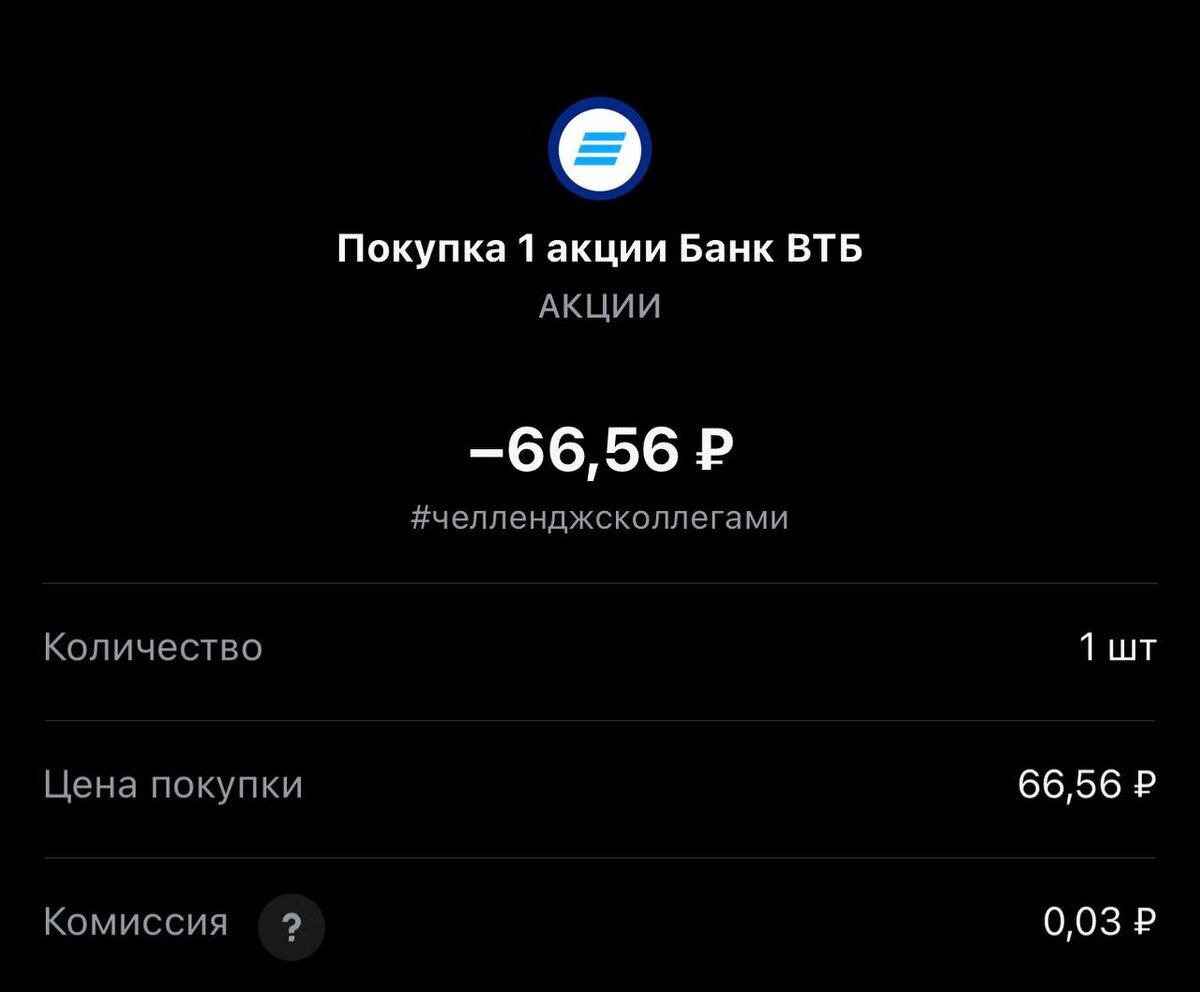 Всем привет! Покупка на сегодня #298, обращаю внимание покупаем один лот. Статистика портфеля на стороннем сервисе, можно посмотреть по "ссылке" Напомню это челлендж с коллегами, каждый рабочий день пополняем брокерский счет на 250 рублей и инвестируем. Если возникли вопросы или есть не понимание, что делать. Задавайте «тут» Покупка #298 🟢 «ВТБ» 66.56 rub #VTBR 1 лот #каждыйсможет #челенджсколлегами 🚪finbazar ✈️ Стас Мироненко 📹Youtube | 📹Rutube