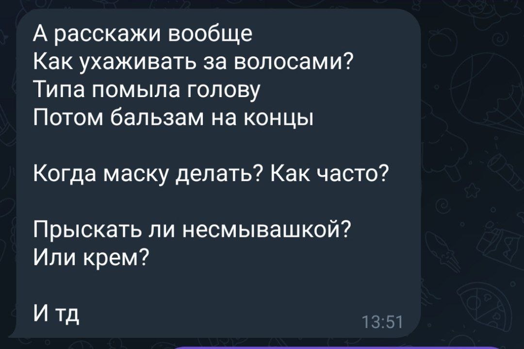 Вещание своего канала я начала с поста о базовом уходе, это было давно, но с тех пор ничего не поменялось. Когда-нибудь я всё-таки наваяю гайд, а пока коротко распишу: 1. Шампунь по типу кожи головы. По мере загрязнения. Кто-то моет ежедневно, кто-то раз в неделю/месяц/год 2. Кондиционер/бальзам по типу и потребностям стержней волос. Каждый раз после шампуня. Наносим отступив 5 см от поверхности кожи головы( корней). Тем у кого ёж 🦔 - просто ладошками водим по торчащим кончикам 3. Термозащита/ несмывашка на отжатые полотенцем волосы. Каждый раз после мытья и кондиционирования. Это может быть спрей, крем, флюид, мист и пр. Форма средства разная, а состав обычно похож, поэтому выбираем как больше нравится, чисто по ощущениям и по нанесению. Мне кремовые текстуры не очень нра, потом руки «грязные», я предпочитаю то, что пшикается. Единственное, обращаю внимание на простой спирт в составе, он может сушить. 4. Стайлинг. По желанию Это была база. Далее спецэффекты: • специальные шампу