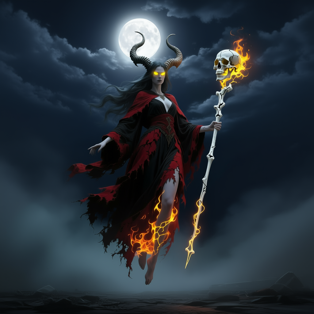 Она была одета в лохмотья красно-чёрного цвета, словно сотканные из пламени и тьмы. Из её головы торчали два изогнутых рога, а глаза горели жёлтым огнём. В руках она держала костяной посох, увенчанный черепом.