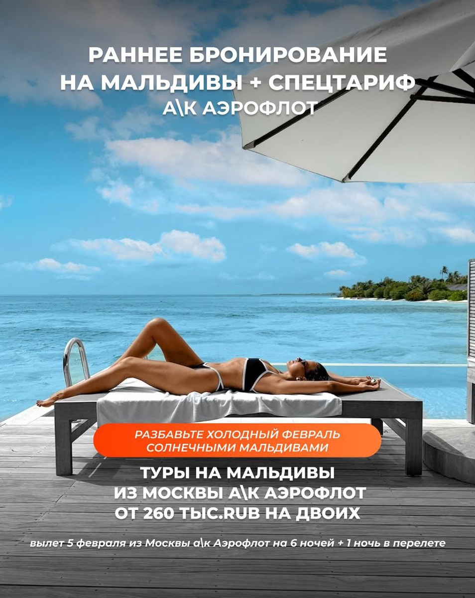 Раннее бронирование на Мальдивы + спецтариф а\к Аэрофлот 🌴 Разбавьте холодный февраль солнечными Мальдивами 🌊 Бронируйте заранее по спец.цене! 💥 Туры на Мальдивы из Москвы а\к Аэрофлот от 260 тыс.Rub НА ДВОИХ 🤩 Рекомендуемые отели 👇🏻 ❤️Malahini Kuda Bandos 4* DBL BB (завтраки) от 340 тыс.Rub ❤️Saii Lagoon Maldives 5* DBL BB (завтраки) от 392 тыс.Rub ❤️Hard Rock Hotel Maldives 5* DBL BB (завтраки) от 392 тыс.Rub ❤️Kurumba Maldives 5* DBL BB (завтраки) от 400 тыс.Rub ❤️AVANI+ Fares Maldives 5* DBL BB (завтраки) от 470 тыс.Rub ❤️Velassaru Maldives 5* DBL BB (завтраки) от 558 тыс.Rub 🚁 трансфер включен 📆 вылет 5 февраля из Москвы а\к Аэрофлот на 6 ночей + 1 ночь в перелете 🌴Цена указана на двоих 🧡По вопросам бронирования пишите в личные сообщения Забронировать тур и задать вопросы: ☎️ +7 (905) 717-51-97 Вера 💬Написать в WhatsApp 💬Написать в Telegram