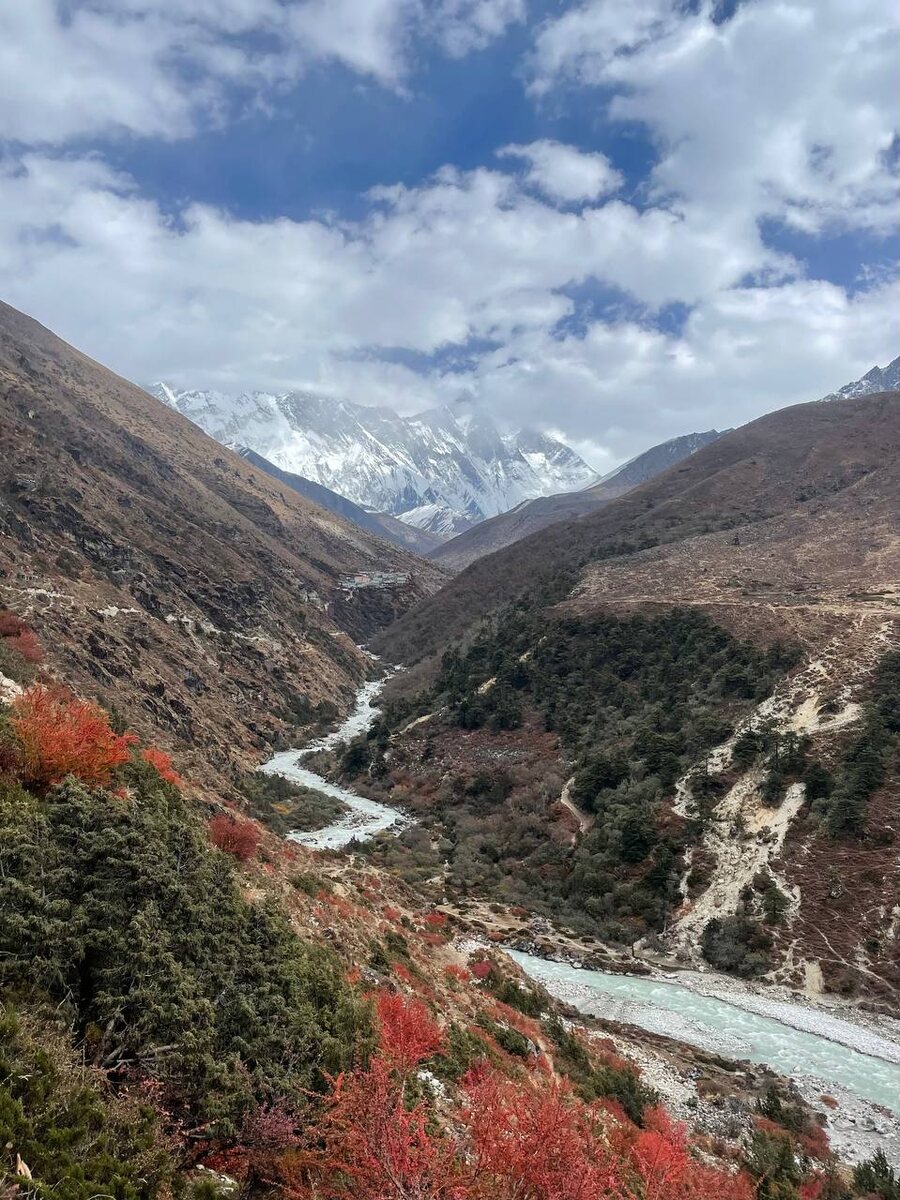 А ещё я назвала бы этот день Днём, когда мы пришли в осень. Как я уже говорила, в горах не надо ждать, когда одно время года сменит другое. Можно переместиться из одного времени года в другое просто набрав или сбросив высоту. Мы же высоту набираем, поэтому из зелёного леса с почти летней жарой переместились в прохладу осени с ярко красными пятнами растений, украшающих склоны. Если перед этим у меня ещё были какие-то сомнения, в какое время года мне больше нравится гулять по этому треккингу - весной или осенью, то сегодня я бы ответила однозначно - только осень. Ну, да. Не цветут прекрасные рододендроновые деревья, украшая путь шапками цветов от нежно розового до бордового. Зато воздух прозрачный, шансов попасть в плохую погоду гораздо меньше, почти всё время стоит солнечная погода, так что ничто не мешает смотреть на горы - теперь Ама-Даблам повернулся к нам другой стороной. И как последний аргумент - разноцветные склоны. К тому же на этой высоте уже ни рододендронов, ни каких-