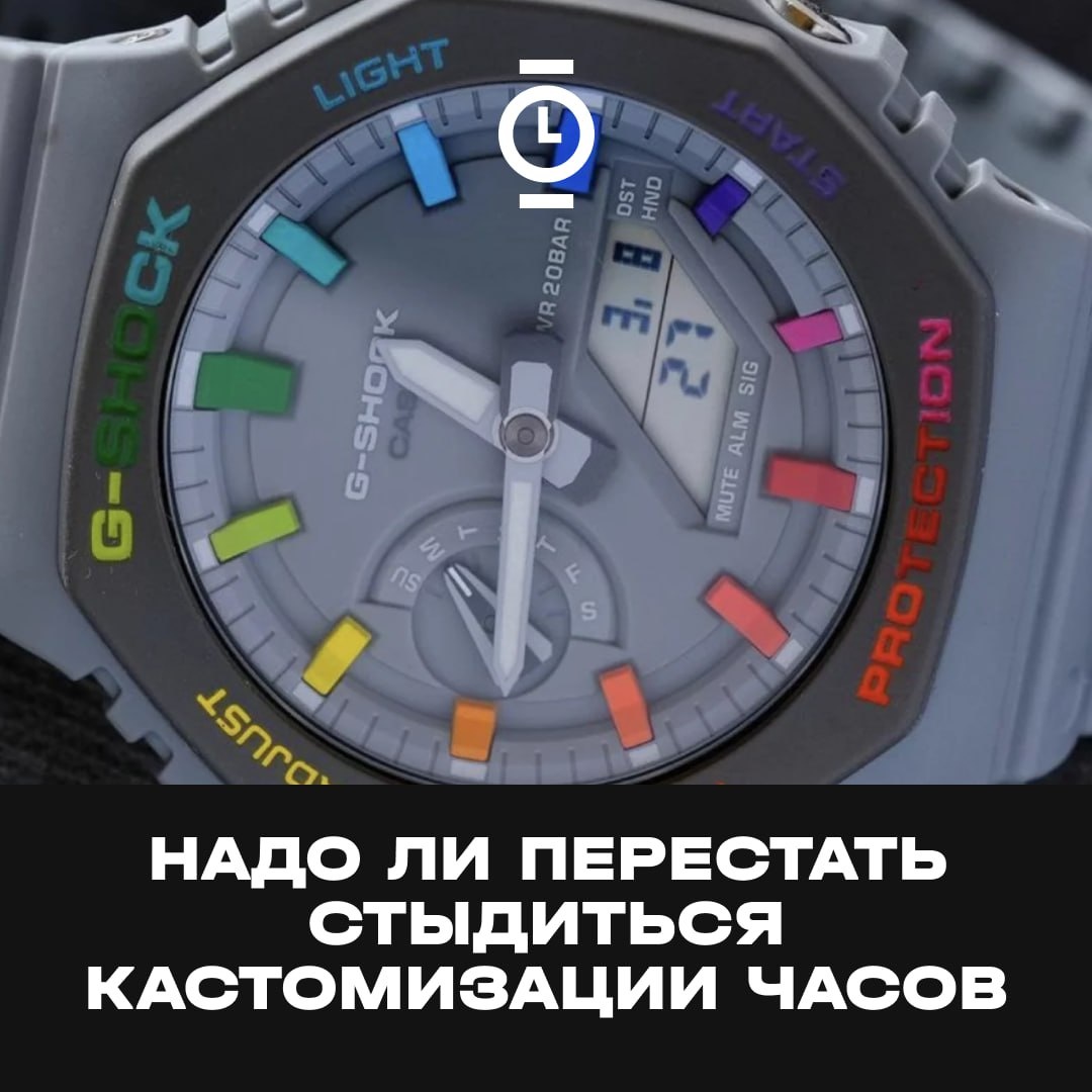 НАДО ЛИ ПЕРЕСТАТЬ СТЫДИТЬСЯ КАСТОМИЗАЦИИ ЧАСОВ #факты_WD Мир давно сошёл с ума по кастомам — автомобили тюнингуют, гитары переделывают под себя, а вот часы до сих пор боятся тронуть. Почему? Ведь даже скрипку XVIII века перестраивают под современные стандарты, и никому это не кажется кощунством. В часовом мире отношение иное: любое вмешательство за пределами замены ремешка считается почти святотатством. Исключение — культовые сообщества вокруг G-Shock и Seiko, где кастом давно стал нормой. Любители этих марок меняют алюминиевые безели на керамические, ставят сапфировые стёкла вместо Hardlex, заменяют стрелки и индексы. Все эти модификации безопасны, обратимы и делают часы по-настоящему личными. Дальше начинается более тонкая работа. Некоторые мастера создают прозрачные задние крышки или новые безели для Speedmaster, превращая знакомый силуэт в нечто индивидуальное. Другие идут дальше — заказывают уникальные циферблаты у таких художников, как The Dial Artist, превращая серийные моде
