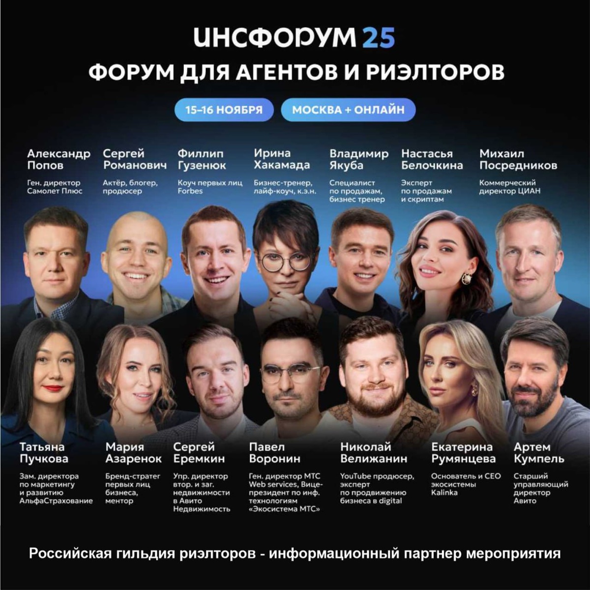 РГР выступила партнером «Инсфорума 25» - крупнейшего мероприятия для профессионалов рынка недвижимости, страхования и финансов. В связи с этим, для членов РГР действуют специальные условия участия — 50% по промокоду «РГР». 🗓 Даты проведения: 15–16 ноября 2025 года 📍 Место проведения: Main Stage, Москва (ул. Шарикоподшипниковская, 13с33) Что ждёт участников: ◽️ Практические инструменты и алгоритмы продаж, брендинга и контент-маркетинга ◽️ Разбор применения искусственного интеллекта ◽️ Ответ на вопрос: кто такой современный агент в эпоху ИИ и какими навыками он должен обладать ◽️ Панельная дискуссия лидеров рынков недвижимости и страхования ◽️ Нетворкинг, 1500+ участников, vip-вечеринка и атмосфера роста ◽️ Доступ к лидерам, новые партнёрства и возможности ◽️ Онлайн-доступ к записи выступлений (кроме выступления Ирины Хакамады) Среди спикеров: Ирина Хакамада — дао жизни и личная устойчивость без выгорания; Владимир Якуба — продажи-2026: живые сценарии звонков и встреч, высокий чек