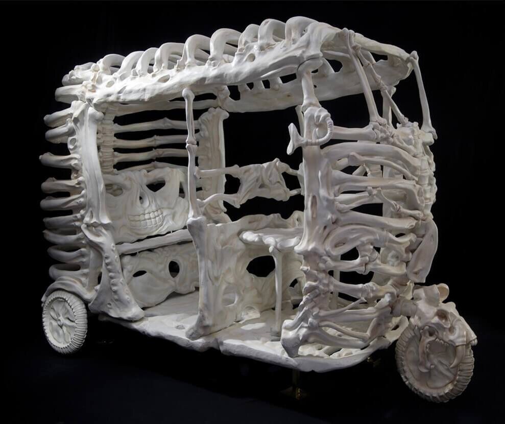Автозавр Рекс — так можно назвать удивительную скульптуру современного индийского художника Джитиша Каллата «Autosaurus Tripous». Это рикша, выполненный в виде скелета динозавра, словно застывшая в камне метафора городской жизни Индии.