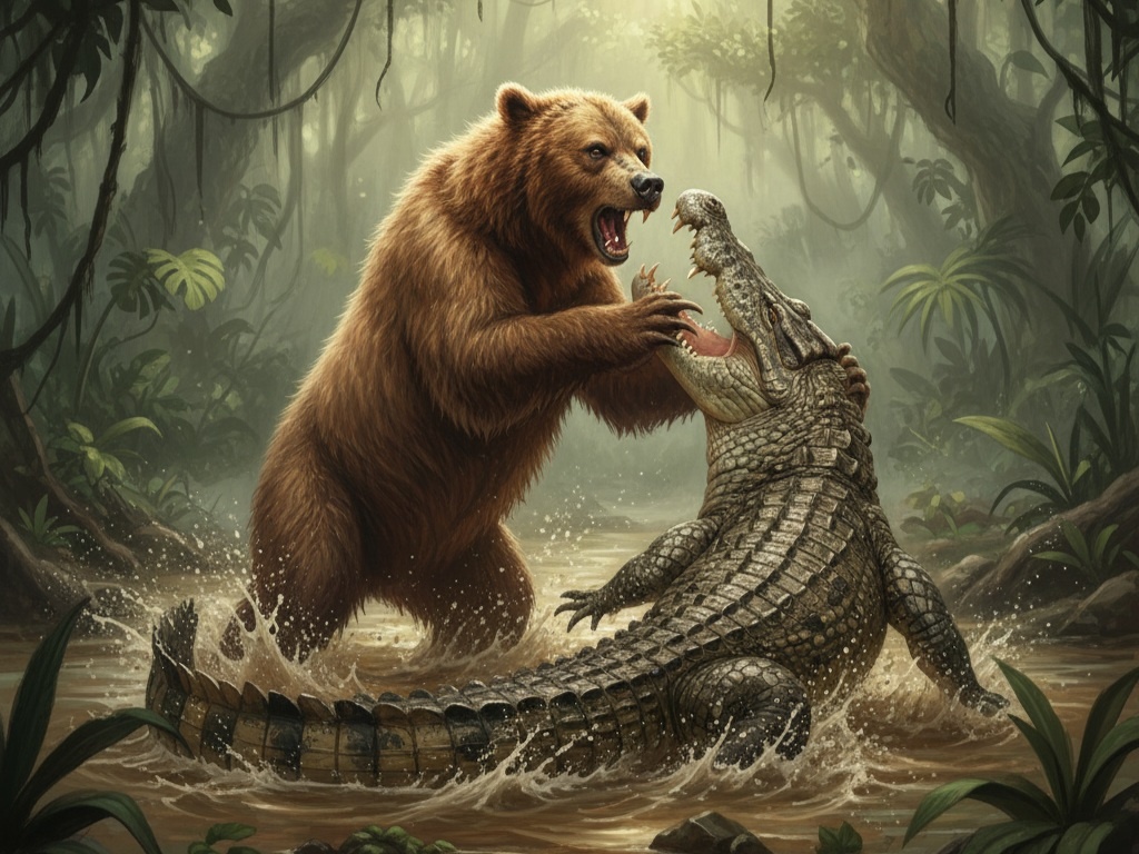 Представьте картину: тишина густого леса вдруг взрывается. Не от раскатов грома и не от падения векового дерева. Нет. Сегодня мы станем свидетелями поединка, который по праву можно назвать столкновением двух миров, двух первобытных сил, двух воплощений чистой мощи. С одной стороны – бурый хозяин тайги, гризли, который всем своим видом кричит: "Это моя земля!" С другой – медленный, но смертоносный властелин мутных вод, крокодил, чей взгляд пронзает насквозь и чьи челюсти не знают пощады.