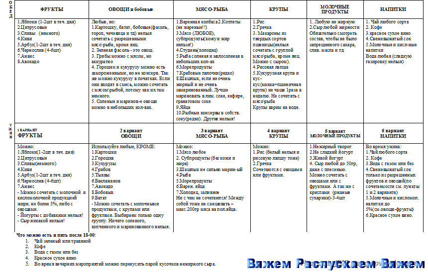 Если пропустили ужин — отмените его. Приемы пищи после 18.00 запрещены. Ничего соленого (речь идет не о соли, солить еду можно), маринованного, копченого, малосольного и т. д. НЕЛЬЗЯ! Смотрите состав продуктов, чтобы там не было запрещенного сахара, сливочного масла и т. д. и т. п. Ниже представлены 7 вариантов ужина. Вам надо выбрать один из этих вариантов и есть только то, что в нем написано, НЕ НАДО ДОБАВЛЯТЬ ПРОДУКТЫ ИЗ ДРУГИХ ВАРИАНТОВ!!!