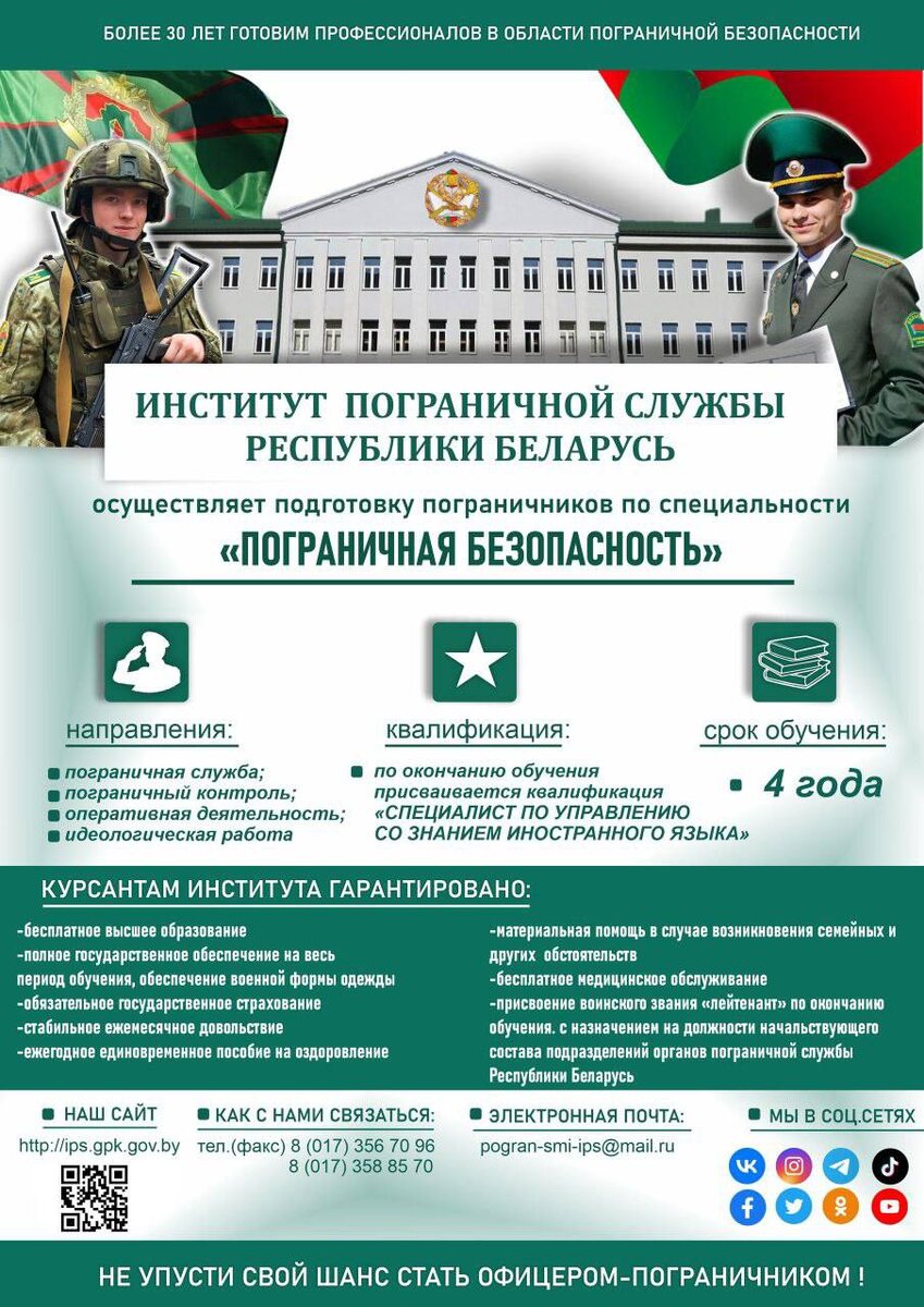 📌Пинский пограничный отряд приглашает абитуриентов! Мечтаешь стать офицером-пограничником? Поступай в Институт пограничной службы Республики Беларусь или Калининградский пограничный институт ФСБ России. 📎До 1 апреля 2026 года необходимо: 🔵Пройти электронную регистрацию 🔵Обратиться в военкомат 🔵Пройти профотбор (медицинский, психологический, физический) 🔵Участвовать в ЦТ ☑️Подробности на сайте: ips.gpk.gov.by #Пинск #Погранслужба #Абитуриенту2026 #Офицер #Поступление 📍📍@Пинский Вестник 📱ЮТУБ 📱САЙТ 📱ИНСТ 📱ВК 📱ОК 📱ФЕ 📱TikTok 📱Прислать новость
