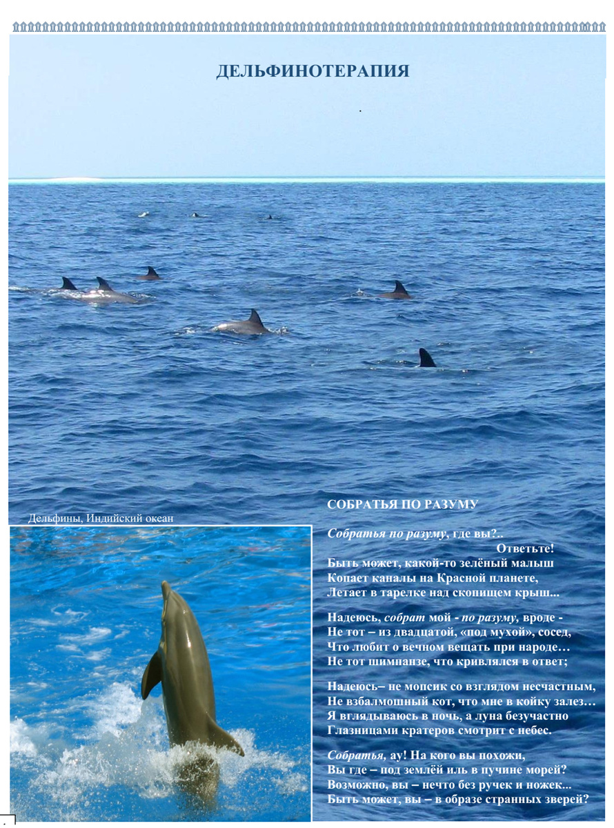 Существует немало свидетельств не только их исключительного интеллекта, но и высокой эмоциональной организации: выяснилось, что дельфины могут испытывать такие чувства, как любовь и сострадание – нам льстит считать эти чувства сугубо «человеческими» и полагать, что исключительными обладателями их является мы – «венец промысла Божьего».