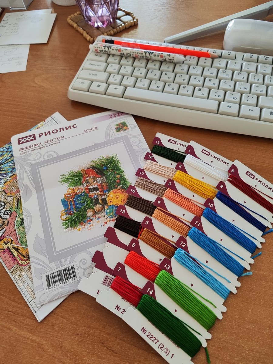 Определилась с новогодним сюжетом и с чистой совестью сделала заказ на WB ☺️ Ну Риолис же!!! Это же Риолис! Как давно я не держала в руках наборы этого производителя! Как долго ждала встречи с ним! Захожу в приложение, смотрю заказ доставлен и лечу в пункт выдачи... волосы назад... Щас думаю, как получу, как сразу же на работе распакую, пощупаю эти шерстяные, тёпленькие, согревающие в зиму ниточки .... Ага!!! Щаа!!! Читать, деточка, не пробовала информацию в карточке товара, прежде чем глаза свои заведующие и руки загребущие в ход запускать ?!!! Какая шерсть? Ну какая шерсть, Оксана?!!!! 🤭 В наборе хлопковое мулине ... мулине .... Да яркие, да праздничные новогодние, но 🥹... Ну кто тебе виноват, слепая тетеря?! Шей теперь вполне себе новогоднего Щелкунчика, но обыкновенными ниточками... Эх, надо хоть основу подобрать интересную что ли и ниточки Brill добавить в работу. Короче какой-то не стандартный Риолис попался мне на глаза) ну ничего, в корзине полно шерстяных ещё, я прове