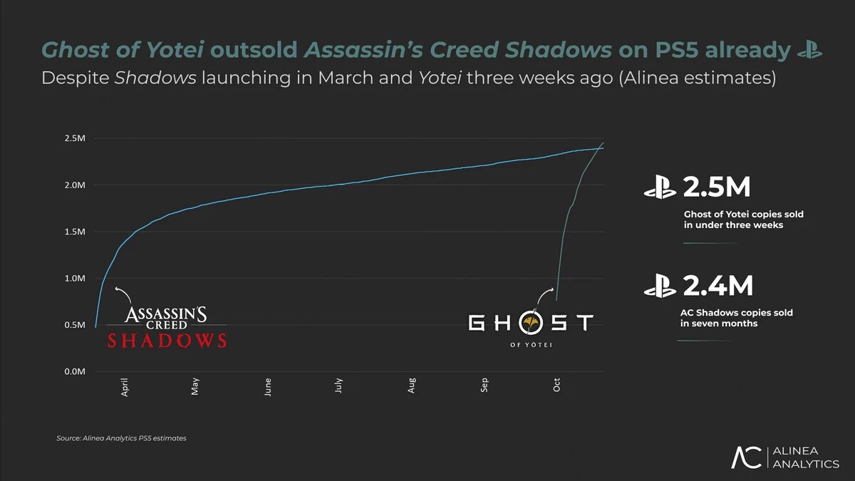 Новый самурайский экшен от Sucker Punch, Ghost of Yotei, продемонстрировал довольно слабый старт, значительно отставая от Ghost of Tsushima, но даже так он уже обогнал по продажам на PlayStation 5 своего главного конкурента в этом году — Assassin's Creed Shadows от Ubisoft. По данным аналитической компании Alinea Analytics, Ghost of Yotei разошлась тиражом в 2,5 миллиона копий за три недели (Ghost of Tsushima продалась 2,4 миллиона копий за три дня), в то время как Assassin's Creed Shadows для достижения отметки в 2,4 миллиона копий на той же платформе потребовалось семь месяцев. Само собой, Ghost of Yotei продается на PS5 быстрее любых мультиплатформенных игр. Причина тому очень проста — владельцы этих консолей наконец-то получили новый эксклюзив, пусть о и, скорее всего, временный. Общие цифры продаж показывают, что игроки считают Ghost of Yotei более качественной и достойной покупки игрой, что справедливо, но забавно осознавать, что сюжеты в этих проектах уж очень похожи друг на др