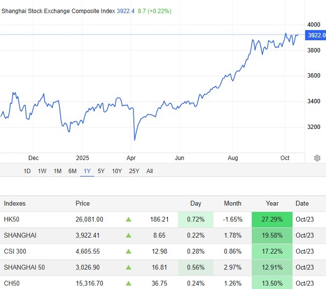 Из позитива: вице-премьер Хэ Лифэн проведёт торговые переговоры с представителями США в Малайзии с 24 по 27 октября, в преддверии возможной встречи Трампа и Си Цзиньпина. Mind Money: «Наконец, Коммунистическая партия Китая не съезде окончательно утвердила следующий пятилетний план страны. Похоже, что в центре внимания находится стремление к самообеспечению технологиями, хотя полный план будет опубликован только в марте».