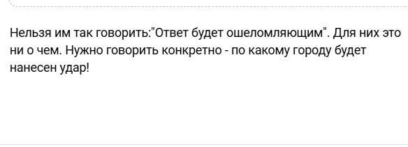Нельзя им так говорить:"Ответ будет ошеломляющим". Для них это ни о чем. Нужно говорить конкретно - по какому европейскому городу будет нанесен удар!