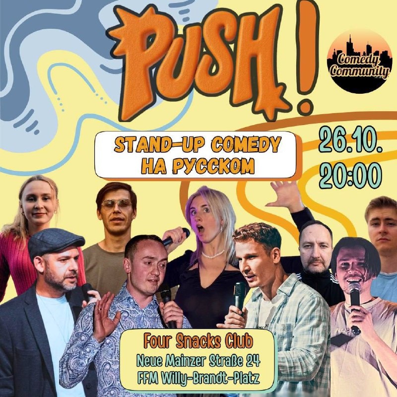 🎤 Друзья! Если кто-то из вас во Франкфурте или неподалёку — приглашаю на мой первый организованный открытый микрофон на русском языке! 🥳 Это будет вечер честного, живого юмора, импровизаций и шуток, которые рождаются прямо на сцене. Выступают новички и опытные комики — кто-то проверяет материал, кто-то переживает экзистенциальный кризис (но с улыбкой 😄). 📍 Место: FourSnacks (PUSH) Neue Mainzer Str. 24, 60311 Frankfurt am Main 🕗 Начало: 20:00 🚪 Вход: с 19:30 Если хотите поддержать, посмеяться и просто круто провести вечер — приходите! 🎟 Билеты: Eventbrite (или можно будет купить на входе за наличку). Будет весело, странно и по-домашнему — как мы любим ❤️ Ну и за репосты отдельная благодарочка!