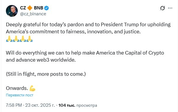 В ответ на пост Глубоко благодарен за сегодняшнее помилование и президенту Трампу за верность Америки принципам справедливости, инноваций и правосудия. Мы сделаем всё возможное, чтобы помочь Америке стать криптостолицей мира и продвигать Web3 по всей планете.