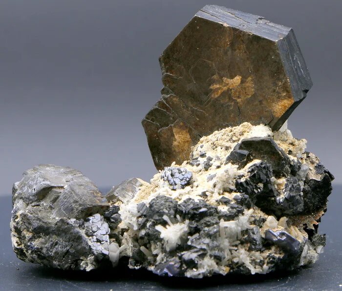 Кристаллы пирротина в срастании с галенитом, сфалеритом и кварцем. Приморский край, Дальнегорское рудное поле, рудник Николаевский. Размер наиболее крупного кристалла 4,5 см. Образец мой, фото Александра Спиридонова. Пирротин - сульфид железа, значительно менее распространенный в земной коре, чем пирит. Химическая формула его обычно записывается как Fe(1-x)S, где х=0-0,125. "Чистый" моносульфид железа (где х=0), носит название троилит и в земных условиях встречается довольно редко, а вот для метеоритов как раз характерен... Пирротин может кристаллизоваться как в гексагональной сингонии (шестиугольные кристаллы как на снимках), так и моноклинной. Моноклинные пирротины обычно обладают хорошо проявленными ферромагнитными свойствами, то есть притягивают стрелку компаса. Поэтому его раньше и называли магнитным колчеданом. Особого практического значения не имеет, но его наличие в рудах может указывать на присутствие в них других ценных минералов, например, пентландита - руды на никель. Хорош