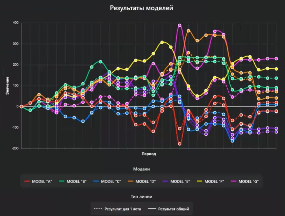 📊 23.10.2025 ┌──────┬────────┬──────┬────┬────────┬────────┐ │МОДЕЛЬ│ПРОГНОЗ │ ВЕР. │ЛОТ │ 1 ЛОТ │ ИТОГ │ ├──────┼────────┼──────┼────┼────────┼────────┤ │ A │ Выше↑ │ 0.58 │ 0 │ 0 │ 0 │ │ B │ Выше↑ │ 0.55 │ 0 │ 0 │ 0 │ │ C │ Выше↑ │ 0.55 │ 0 │ 0 │ 0 │ │ D │ Ниже↓ │ 0.70 │ 1 │ -2 │ -2 │ │ E │ Ниже↓ │ 0.70 │ 1 │ -2 │ -2 │ │ F │ Ниже↓ │ 0.60 │ 1 │ -2 │ -2 │ │ G │ Ниже↓ │ 0.50 │ 0 │ 0 │ 0 │ └──────┴────────┴──────┴────┴────────┴────────┘ Результаты с 15.09.2025 по 23.10.2025 📅 ┌────────────┬───────┬────────┐ │ Модель │ 1 лот │ Общий │ ├────────────┼───────┼────────┤ │ MODEL "A" │ 20 │ -21 │ │ MODEL "B" │ 136 │ 90 │ │ MODEL "C" │ -24 │ 10 │ │ MODEL "D" │ 71 │ 41 │ │ MODEL "E" │ -121 │ -104 │ │ MODEL "F" │ 180 │ 180 │ │ MODEL "G" │ 78 │ 229 │ └────────────┴───────┴────────┘