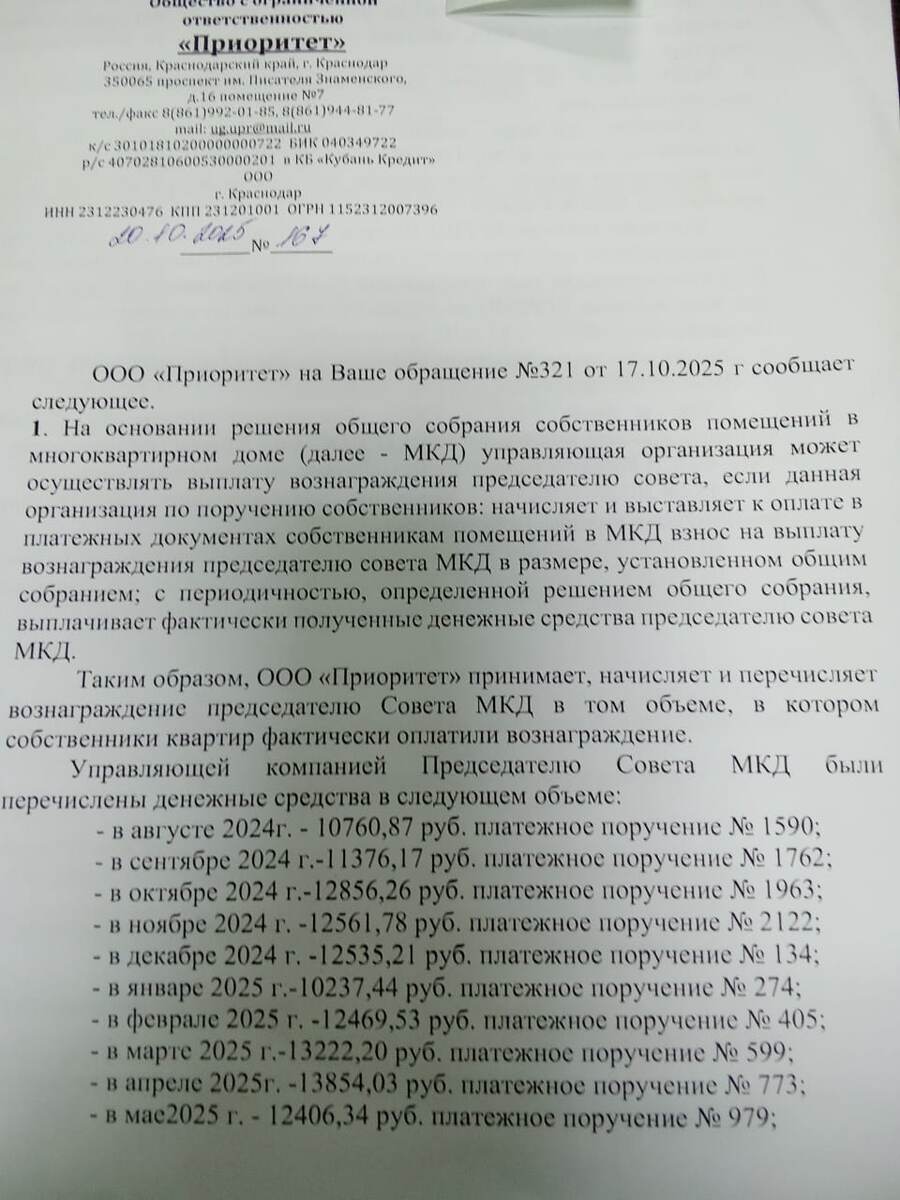 То что письмо, вброшенное управляйкой Приоритет - это конкретная провокация видно из того, что единственное что в письме жирным было выделено - это суммы, выплаченные мне. Ни про неработающие фонари, ни про непонятного ИП Штерле жирным не выделяли. Только про деньги, перечисленные мне. Обратите на это внимание.