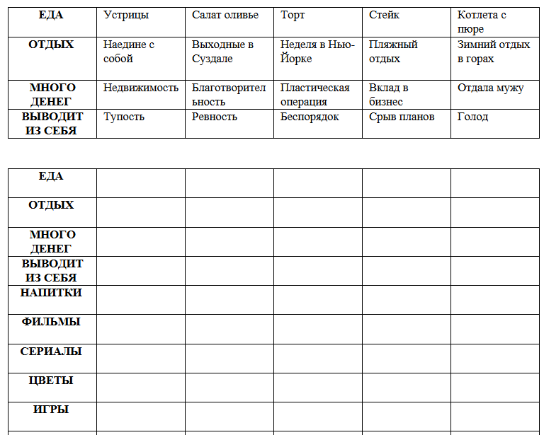 Испытания из шоу Ставка на любовь, 1 сезон, 2 выпуск Мужчинам необходимо правильно выстроить последовательность, в каждой из четырёх категорий: “ЕДА”, “ВЫВОДИТ ИЗ СЕБЯ”, “МНОГО ДЕНЕГ”, “ОТДЫХ” Эта игра на сближение, благодаря ей вы можете лучше узнать друг друга, в нее можно играть вместе, то есть, каждый из партнеров может прописать свои варианты, а потом вместо разобрать, ошибки. Для вас подготовлен шаблон и примерные варианты, можно также написать свои или даже добавить ещё категории, например: фильмы, сериалы, игры, напитки, цветы, сладкое, машины и многое другое. Например: ЕДА: 1. Суши 2. Пицца 3. Шашлык 4. Борщ 5. Каша 6. Пирожки 7. Фаст-Фуд 8. Авокадо 9. Омлет 10. Рыба ОТДЫХ: 1. Море 2. Поход 3. Рыбалка 4. Дома за просмотром сериалов 5. Дача 6. Зимний отдых в горах (лыжи, сноуборд) 7. Тусовки 8. Прогулки в парке 9. Спорт зал 10. Выставки/ музеи МНОГО ДЕНЕГ: (т.е на что он/она тратит, когда есть деньги) 1. Косметика 2. Одежда 3. Всё в дом 4. Доставки еды 5. Откладываю/коплю 6. Пу