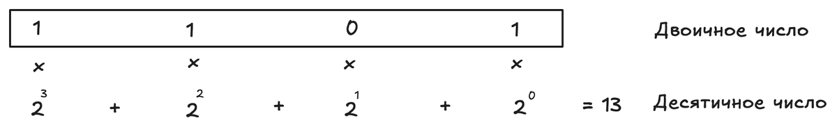 Итог: 1101 (двоичное) = 13 (десятичное).
