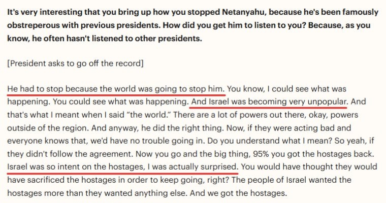 В ответ на пост 'The WORLD was going to stop him... Israel was becoming very unpopular' More from Trump's Time interview he was 'surprised' that Israelis wanted hostages back 'more than anything else'