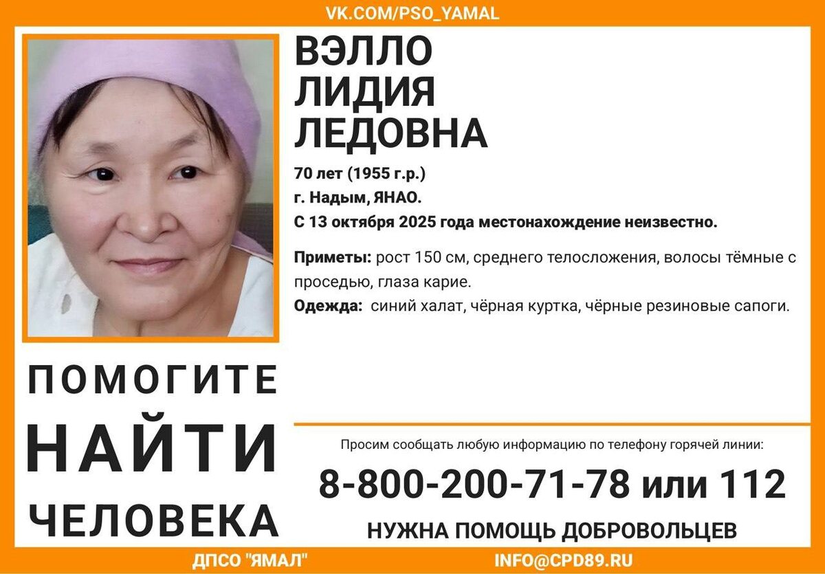 Внимание! Помогите найти человека! Пропала #ВЭЛЛО Лидия Ледовна, 70 лет, #Надым, #ЯНАО. С 13 октября 2025 года её местонахождение неизвестно. Просим сообщать любую информацию о местонахождении пропавшей по телефону горячей линии ДПСО «ЯМАЛ» 8-800-200-71-78 или 112.
