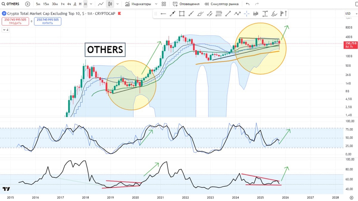 ✨ OTHERS 2020 vs. 2025 Сейсас можно сказать, что в истории Биткоина и всей криптовалюты было два реальных чёрных лебедя: это ковид-кризис 2020 и нынешний дамп 2025. Оба раза криптовалюта смогла обрушиться до уровней, которые казались давно и невозвратно преодолёнными. На картинке, которую я приложил, вы видите график OTHERS. Если кратко, это общая капитализация всех альткоинов, исключая топ-10 по рыночной стоимости. Почему это важно? Потому что именно этот график лучше всего отражает истинное положение дел и потенциал для настоящего альтсезона, когда "стреляют" не только крупные, но и множество средних и мелких проектов! 🚀 Мы можем видеть поразительное сходство между ситуацией в 2020 году, перед тем самым Ковид-дампом, и текущими движениями сейчас, в 2025 году. 😮 Перед началом мощнейшего альтсезона тогда, мы видели глубочайший дамп – одна огромная красная свеча с длинной тенью вниз. Это был момент абсолютного страха, неверия и капитуляции, когда многие продавали свои активы в пан