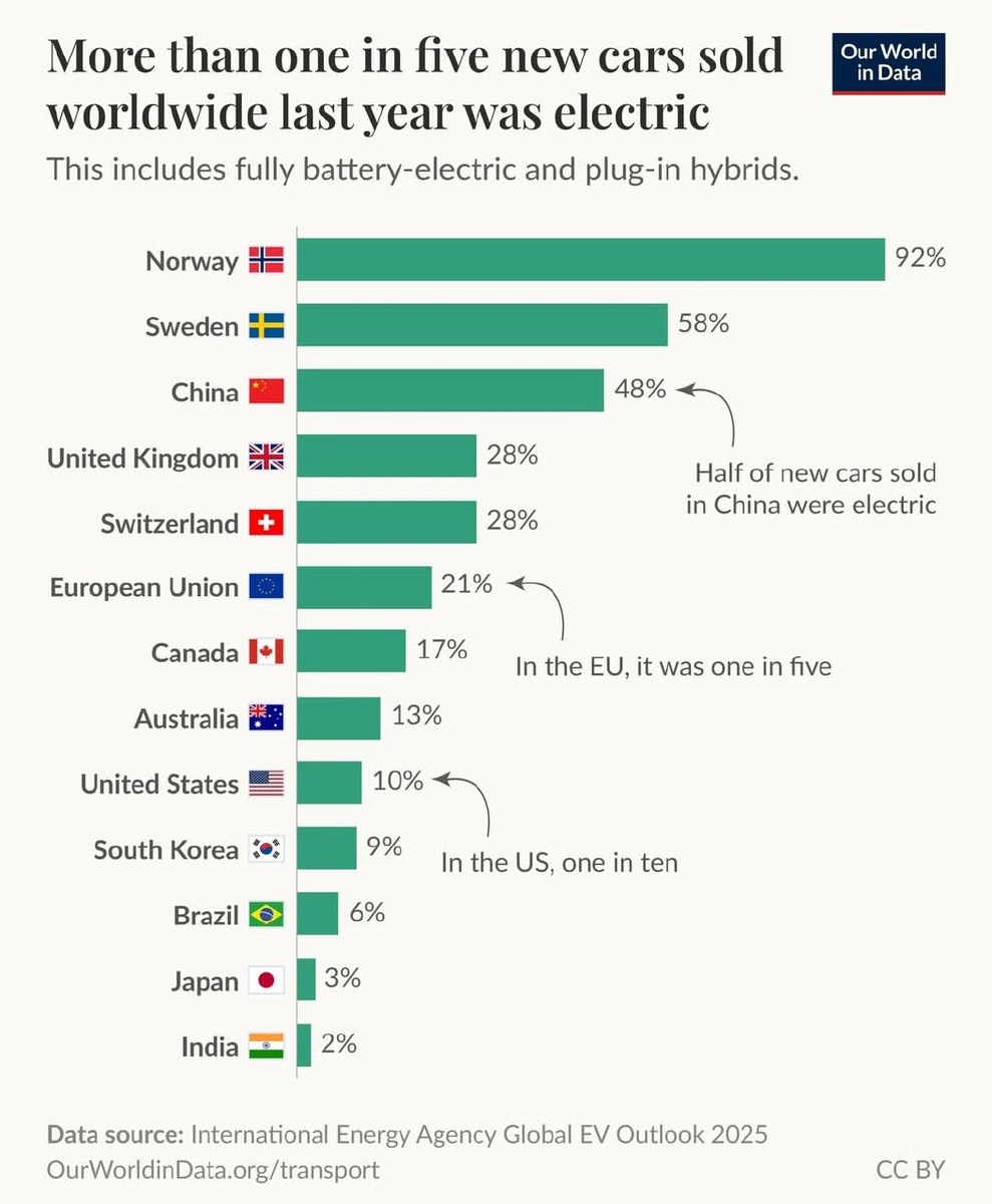 Каждый пятый новый автомобиль, проданный в мире за последний год, был электрокаром. Лидером остаётся Норвегия, где доля электрокаров достигла 92%, за ней следуют Швеция (58%) и Китай (48%), который стал крупнейшим мировым рынком электромобилей. В Европейском союзе на долю электрокаров пришлось 21% продаж, в США — 10%.