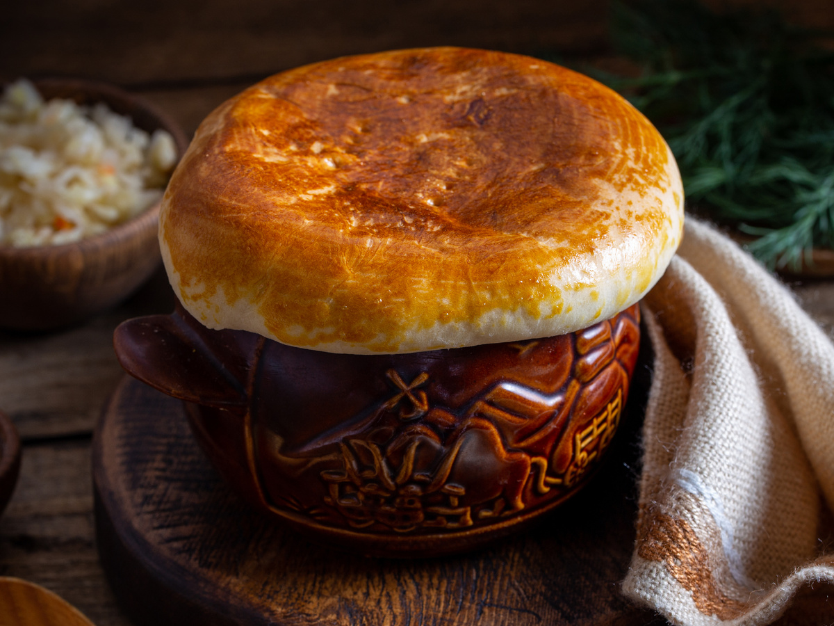 Подавать прямо в горшках. Тесто съедается вместе с супом – оно ароматное, пропитанное паром изнутри и румяное снаружи.