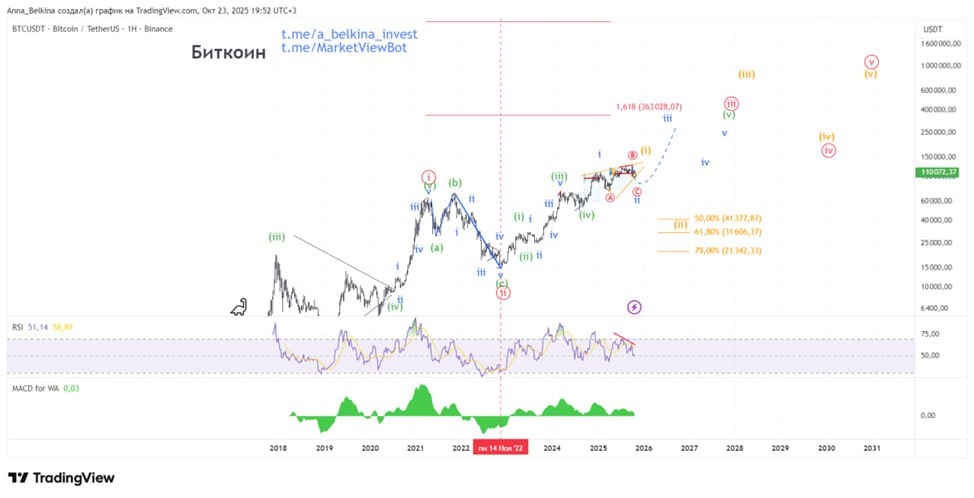 #BTC Для недавно присоединившихся к каналу видео начала с пояснения причин роста биткоина во времени: вход в эпоху цифровизации и узаконивание цифровых валют на смену фиатных. Это необратимый процесс. Среднесрочно для меня стоит вопрос текущей структуры: 1. Идет ли формирование заходной ii of (iii) импульса через бегущую структур. Тогда коррекции здесь небольшие и в скором времени можно ожидать хорошего длительного роста. Минус гипотезы – волна ii of (iii) становится слишком крупной по отношению вторым волнам старшей размерности, что делает доп гипотезу оранжевым всё более актуальной. 2. вторая гипотеза (оранжевым) заключается в том, что движение завершается через конечную диагональ, здесь будет выкуп текущей коррекции на постановку еще одного верха, далее ожидаю существенную коррекцию на биткоине. Это вполне согласуется с гипотезой движения по S&P500. За вероятность глубокой коррекции выступают: 1. Недельный RSI сформировал накопленную медвежью дивергенцию. 2. торговые объемы п