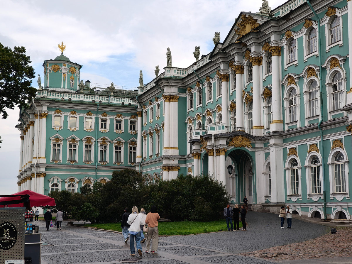 После завтрака мы отправились прямиком к Зимнему дворцу. Этот день стал началом программы по ознакомлению внука с основными достопримечательностями Санкт-Петербурга. Время было около десяти утра, но к воротам дворца уже стояла довольно большая очередь. Эрмитаж - один из главных музеев города, который необходимо посетить, особенно, если вы здесь впервые. Я посещаю Эрмитаж уже в третий раз, то есть в каждый свой приезд, и буду это делать ещё и ещё, потому что музейная коллекция дворца необъятна, к тому же каждый раз появляются новые тематические выставки.