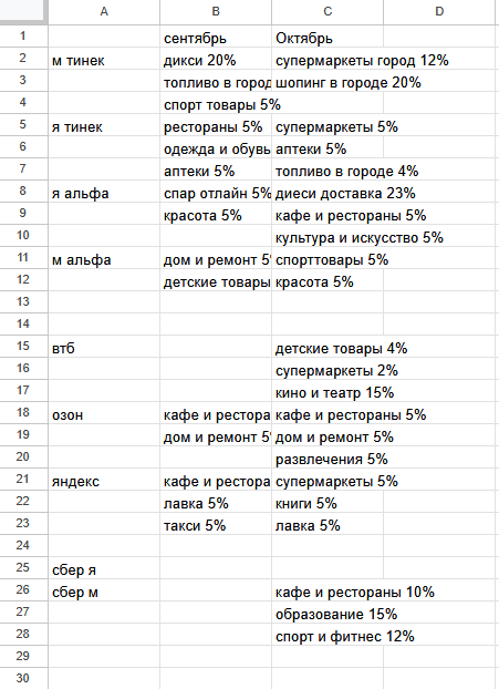Уже не раз писала о том, что когда подходит пора, мы садимся с мужем на пару и выбираем категории на двоих. У нас семейный бюджет, поэтому нам интересно, чтобы было выбрано как можно больше категорий и не было излишнего задвоения. Понятно, что повторы бывают, часто приходится выбирать одну и ту же категорию и там и там просто потому, что больше брать нечего. Но иногда бывают ситуации, что выбирая вдвоем, мы получаем более полный набор категорий повышенного кэшбэка на следующий месяц. А выбрав категории, я сажусь и записываю их, чтобы не забыть. Понятно, что я запоминаю базовый вещи, те которыми пользуюсь периодически, а вот про редкие могу и забыть. Например, в октябре Т-Банк дал мне 5% на маркетплейсы, естественно я это запомнила, а вот у кого я смогла выбрать повышенный процент на обучение можно не держать в голове. Я оплачиваю обучение раз в месяц, тут можно открыть файлик и подглядеть. Кстати, в файлик я периодически не записываю совсем не интересные варианты, чтобы не тратить свое время, поэтому на скриншоте ниже иногда встречаются пропуски.