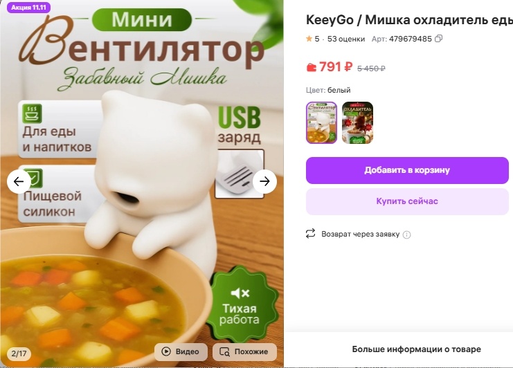 Мишка устанавливается на край посуды, немного наклоняется, чтобы поток воздуха был направлен непосредственно на горячее блюдо и включается. Всего через пару минут еда или напиток остынут до комфортной температуры!