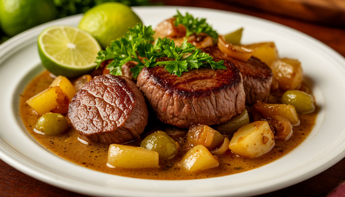 9. Говяжьи медальоны в сливочно-фейхоа соусе с карамелизированным луком