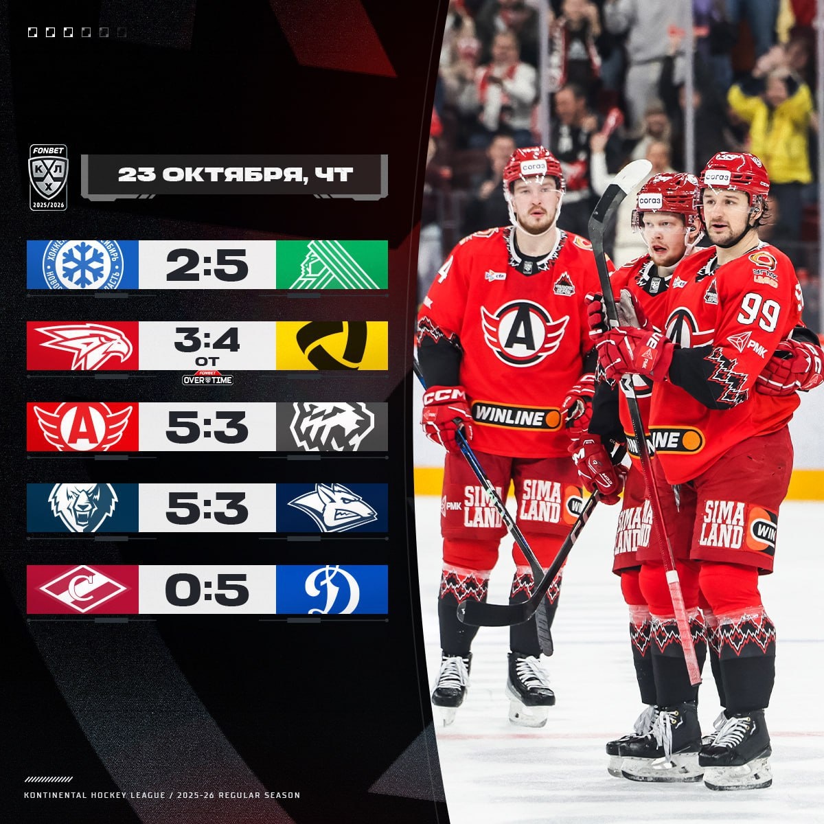 ⚡️ Итоги игрового дня в КХЛ! «Динамо» разгромило «Спартак», забросив пять безответных шайб (5:0). «Нефтехимик» дома победил «Металлург» (5:3). «Автомобилист» одержал победу над «Трактором» в игре с восемью шайбами (5:3). Также после дисквалификации на лёд вернулся Анатолий Голышев. «Северсталь» победила «Авангард» (4:3 ОТ) и одержала шестую победу подряд. «Сибирь» проиграла «Салавату Юлаеву» (2:5) и потерпела третье поражение подряд. @russian_rt_sport