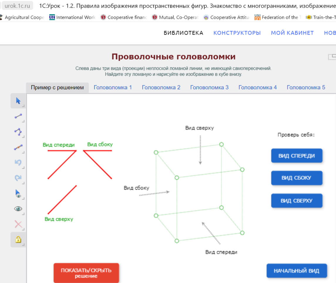Один их хороших инструментов, чтобы потренировать себя на проволочных головоломках, предлагает 1С. Да-да, вы не очитались. 1С - это не только корпорация по автоматизации бухгалтерии, но и уже целая образовательная экосистема для школы. Тут выложено много интересных уроков по разным предметам, а также есть математические модели. Вот, например, 5 проволочных головоломок для начала, а потом и продолжения. Тут нужно учиться видеть с разных ракурсов, можно крутить фигуры, чтобы лучше представлять разные грани, виды и видимость узора. Также есть отличный блок по построению сечений.