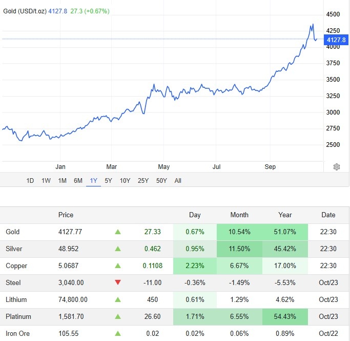 Сегодня цены на золото выросли до $4126 за унцию, остановив двухдневное падение. Инвесторы, не вышедшие из актива, могут поблагодарить снова расшалившуюся геополитику и лично товарища Трампа, который денно и нощно бдеет о России. Ну, не только о России, а и об ограничениях на экспорт программного обеспечения в Китай. Ну, а российские поклонники золота могут поблагодарить ФРС, почти открыто обещающую еще два снижения ставки до конца года. Тем не менее, золото осталось примерно на 6% ниже своего недавнего пика на фоне фиксации прибыли после повторных рекордных максимумов, что стало самым резким недельным падением за более чем пять лет. В интервью Business FM лидер Mind Money Юлия Хандошко поясняет: «В целом не стоит паниковать, нужно помнить, что планомерного роста без падений на фондовом рынке практически не бывает. Всегда, когда есть стремительный рост, нужно быть готовым к тому, что наступит период стопора. И вот, кажется, что мы на золоте это увидели.Я думаю, что дальше все равно буд
