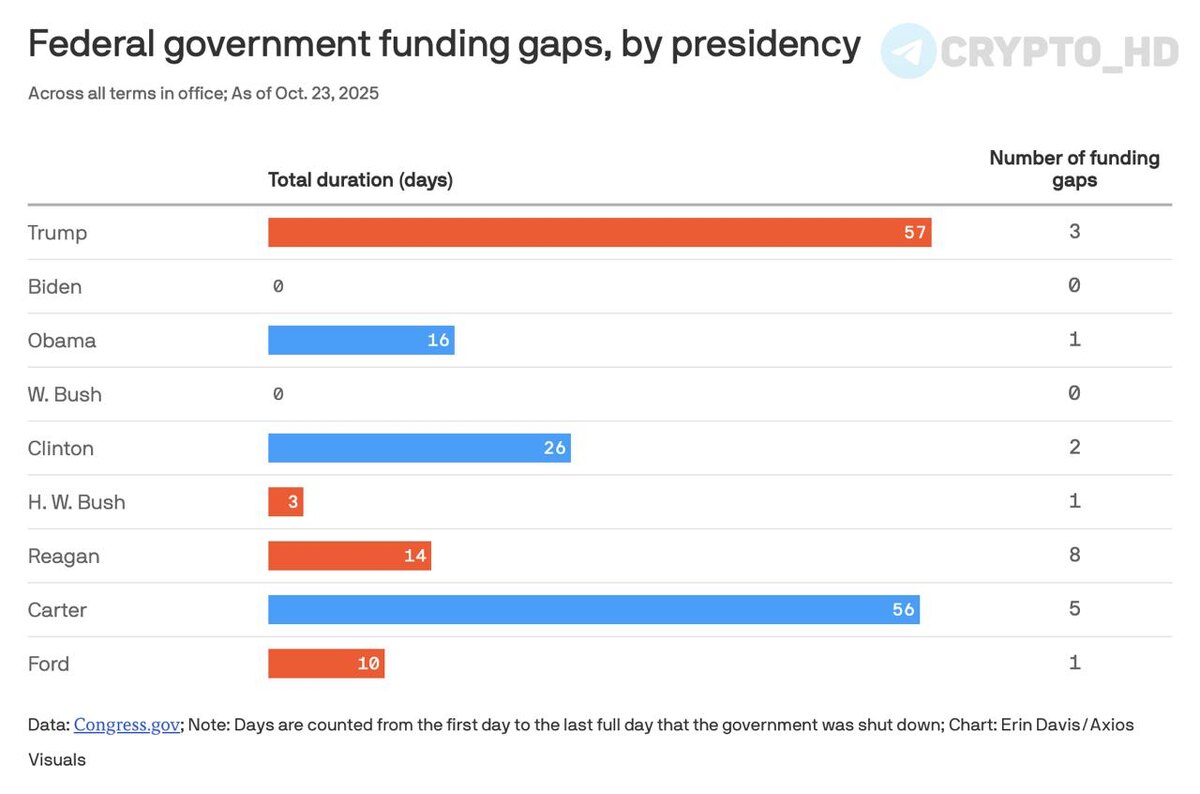 🇺🇸 Дональд Трамп установил антирекорд по длительности шатдауна (Axios) Федеральное правительство США при Трампе (с учетом обоих сроков его президентства) суммарно не работало уже 57 дней. Это стало новым историческим рекордом, превзойдя предыдущий максимум времен Джимми Картера. Crypto Headlines