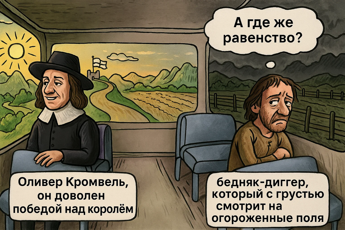 Победа над королем не принесла мира. В армии и среди бедноты появились радикальные движения, которые хотели идти дальше: Оливеру Кромвелю и богатым собственникам, которые уже получили то, что хотели (землю и власть), такие идеи совсем не понравились. Кромвель жестоко подавил и левеллеров, и диггеров. Революция начала "пожирать своих детей". В 1653 году Кромвель, опираясь на армию, разогнал Долгий парламент ("Ни одна собака не тявкнула!"). Власть перешла к нему. Он получил титул лорда-протектора Английской республики. Фактически это была военная диктатура: Но были и успехи: Кромвель умер в 1658 году, оставив страну на пике могущества, но уставшей от диктатуры. После смерти Кромвеля начался хаос. И правящая элита решила... вернуть короля! В 1660 году на трон пригласили сына казненного Карла I — Карла II Стюарта. Это называется Реставрация. Король обещал править вместе с Парламентом и не трогать порядки, установленные революцией. Но Стюарты ничему не научились: Англичане, только что переж
