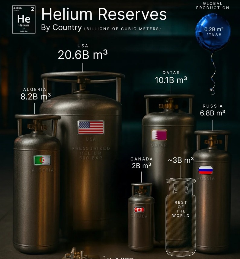 Аналитики VisualCapitalist оценили, какие страны контролируют наибольшие известные запасы гелия. Гелий уникален тем, что является невозобновляемым ресурсом на Земле. Он образуется глубоко под землёй в результате радиоактивного распада и часто добывается как побочный продукт при добыче природного газа. Попадая в атмосферу, гелий улетучивается в космос, что затрудняет его восстановление или переработку.
