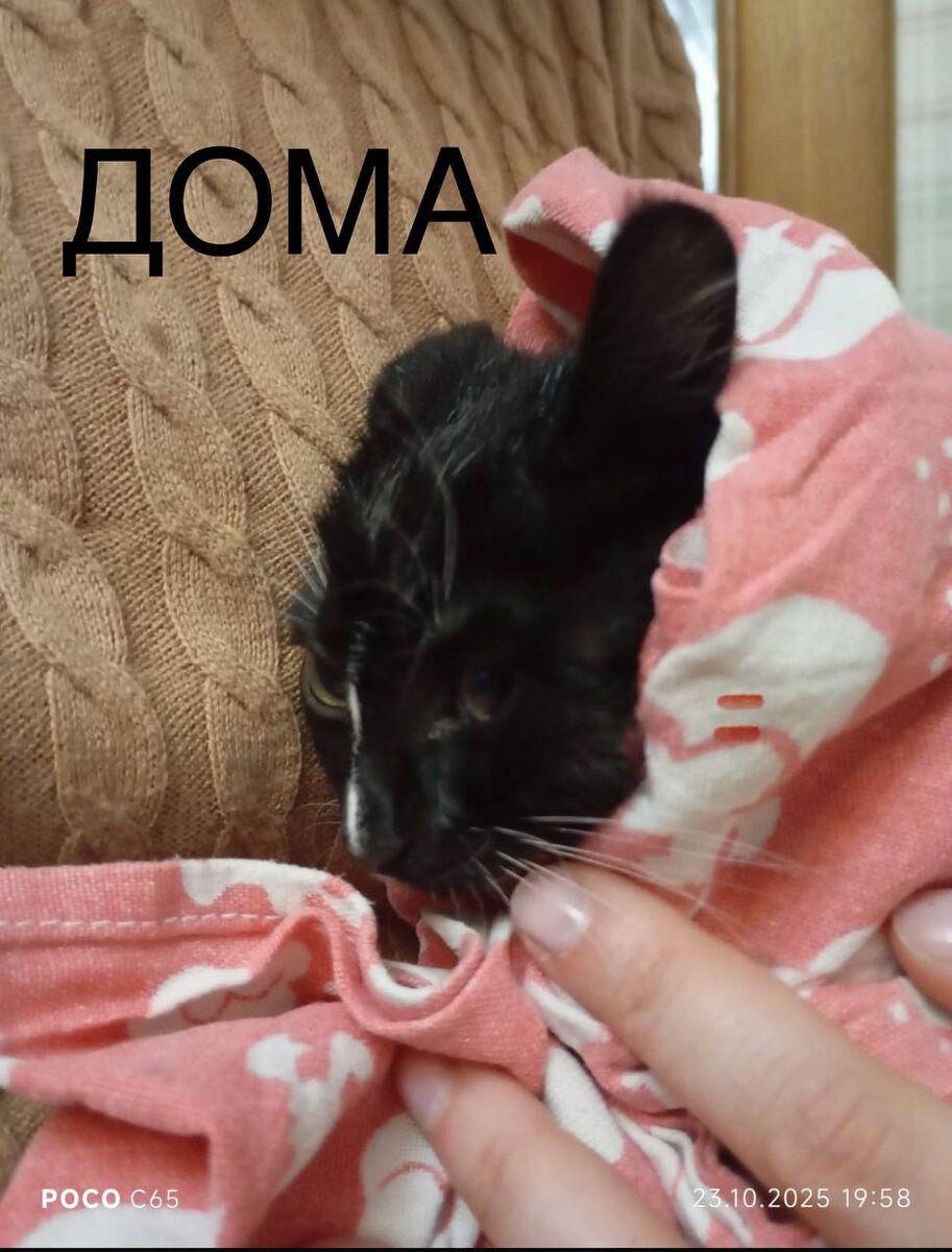 Остался черный мальчик, примерно 2,5 месяца, вполне адекватный, даже мурлыкал, страшно ему конечно, но будет ласкуша!