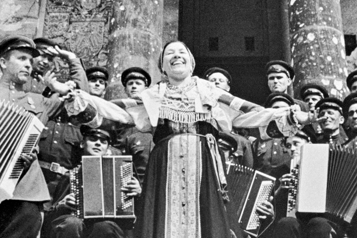 Она продолжала разъезжать с концертами, зарабатывать деньги. На эти деньги Русланова купила две батареи «Катюш» для корпуса своего мужа. А в 1945 году вместе с советской армией оказалась в Берлине, где 2 мая 1945 года (как сама потом говорила, «на крыльце Рейхстага») пела в концерте с казачьим ансамблем. И расписалась на Рейхстаге вместе с солдатами.