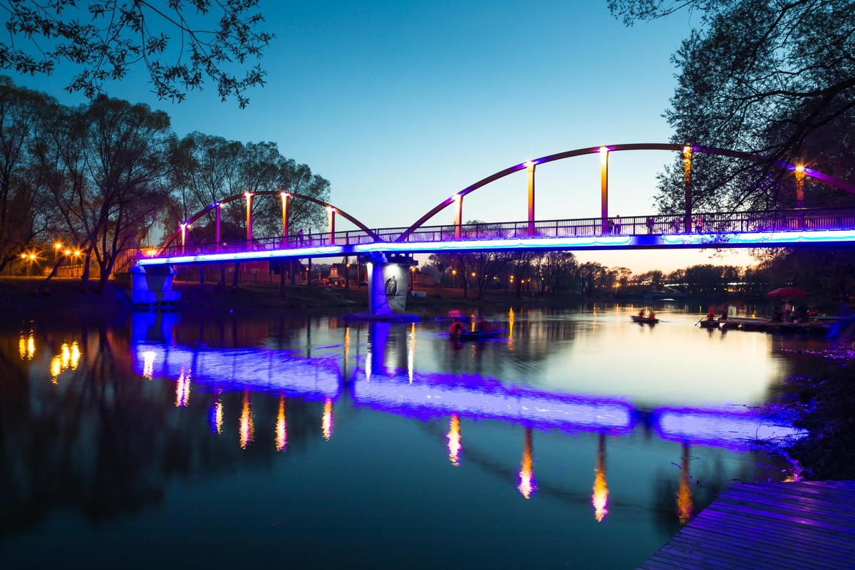 В последние дни парк на Везенице затемнён, только одна аллея у реки горит огнями трёхглавых фонарей, освещая центр его, да подсветка торговых павильонов радует глаз. Вечером на его полутёмных аллеях гуляющих мало, очень мало. Пробежит стайка молодёжи, спешит домой одинокий прохожий, пройдёт женщина, с собачкой на поводке. Обычно их выгуливают женщины. Набережная реки усыпана золотом листвы. Ветра нет, и она лежит, не шелохнётся. Октябрь выдался сухой, тёплый и так хорошо дышится у реки. Уличных гитаристов сегодня нет, вместо них несколько пар влюблённых. У моста казака головы Везенина, я так его называю, гулял здесь в XVII веке некий голова Везенин, вода горит синим огнём от подсветки моста, а дальше на тёмной воде дрожат большие жёлтые пятна от фонарей. Классическая музыка льётся из репродукторов, ощущение, словно ты в концертном зале, на реке... По пути домой светофоры приветливо мигают на перекрёстках одиноким пешеходам. В ноябре к нам приезжают на гастроли белорусские «Пе