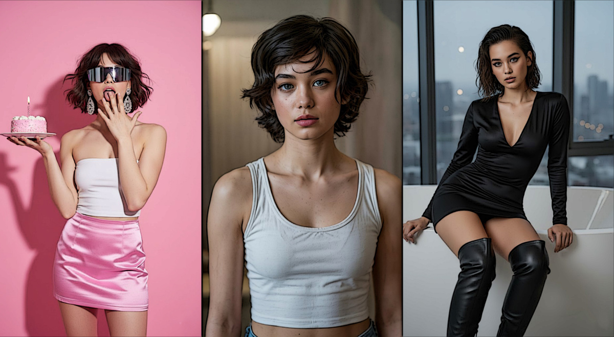 Немногочисленные мужчины-читатели явно рады визуальному образу. Получился со второго раза, предлагаемый промпт был немного другой. Пришлось править, так как эпизодически нейронка начинает тупить то на "мини-юбку", то на "топ", ругаясь, что «не может генерировать людей в таком образе». Ок. Не можешь, попробуй еще раз…