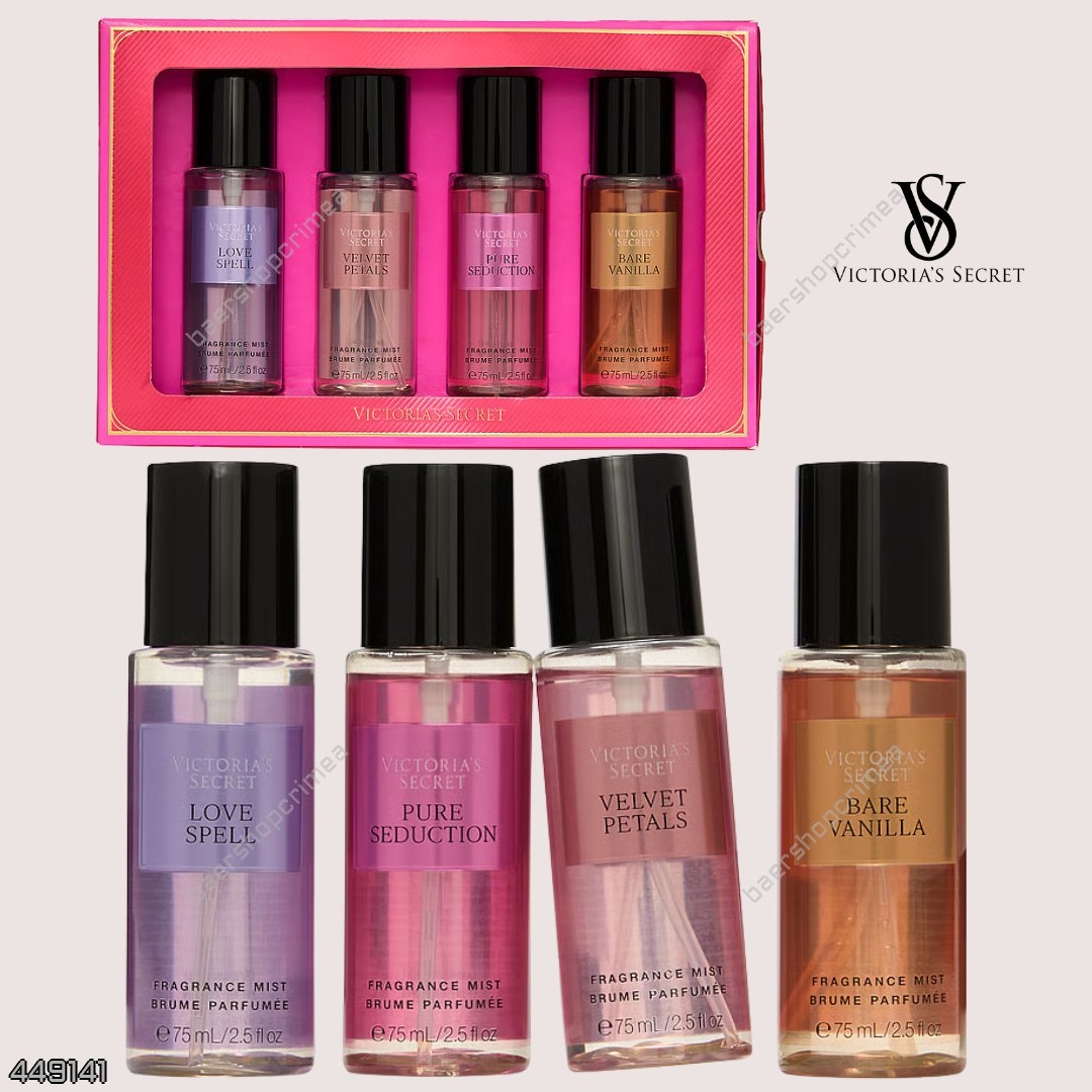 #Victorias_Secret 🇺🇸 Подарочный набор из 4х предметов 2420₽ + вес Мист для тела Pure Seduction. Верхние ноты: дыня Касаба, красная слива. Сердце: цикламен «Утренняя роса», фрезия. База: чистый мускус, розовое дерево. Мист для тела Velvet Petals. Верхние ноты: искрящийся карамбольный фрукт, сладкая миндальная глазурь. Сердце: кокосовое молоко, засахаренные цветы абрикоса. База: уютный мускус, сливочный сандал. Мист для тела Love Spell. Верхние ноты: красное яблоко, цветущая вишня. Сердце: чистая лилия, свежий персик. База: воздушный мускус, светлые леса. Мист для тела Bare Vanilla Mini. Верхние ноты: бергамот, цветок яблони. Сердце: белая орхидея «ангел», сахарная вата Основа: взбитая ваниль, светящаяся амбра. ID: 449141 для заказа писать - ♥️@dianabrill