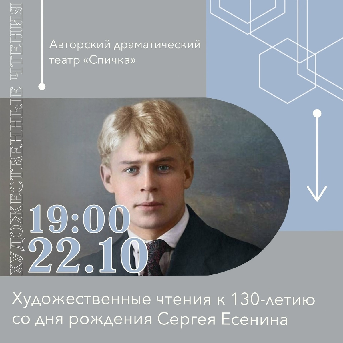 К 130-летию со дня рождения актёры театра «Спичка» Оксаны Половинкиной читали в Арт-резиденции «Соты» его стихи, прозу, публицистику. С экрана большого монитора на нас смотрел красивый синеглазый блондин с пшеничной прядью на лбу. Он был страшно талантлив и страшно красив, за такое счастье, по жизни, приходится платить. Он и заплатил сполна... Я погибла не виною,