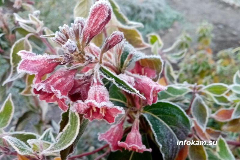 Заморозки украсили картину осенней природы. Желтеющие и багряные листья в ободках инея выглядели живописно. Камышане поделились фотографиями. Конечно, жаль, что эта красота увядающей природы. Минусовое понижение температуры уничтожат поздние осенние цветы и цветущие кустарники — как вейгелу на одной из фотографии...