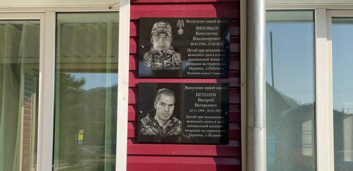 В Усть-Мунинской школе Майминского района открыли мемориальные доски в память о погибших участниках спецоперации Валерии Петеневе и Константине Зиновьеве. Как сообщили в правительстве Республики Алтай, в мероприятии приняли участие родные и близкие бойцов, школьники, жители села. По словам и. о. зампреда правительства РА Ирины Петровской, выпускники Усть-Мунинской школы Валерий Петенев и Константин Зиновьев проявили высшую степень мужества и героизма, защищая Родину. «Их имена теперь навсегда вписаны в историю Республики Алтай. Их пример верности Родине – напоминание каждому о цене свободы и человеческом достоинстве», – сказала она.